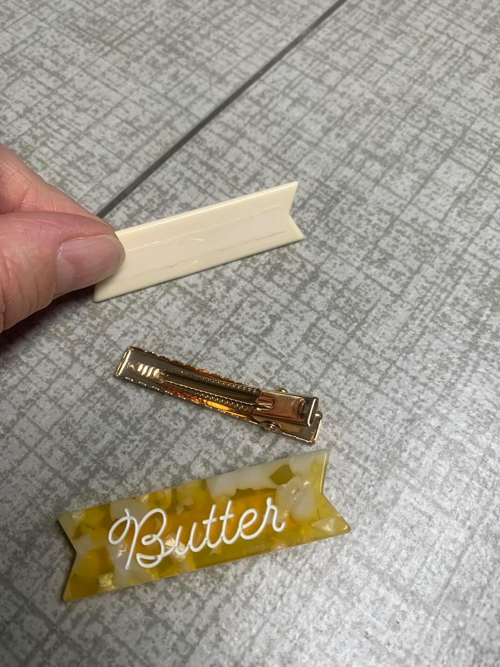 • 'Butter' : Separated butter yellow cellulose acetate with white cursive ink inlay and a gold alligator clip on the back